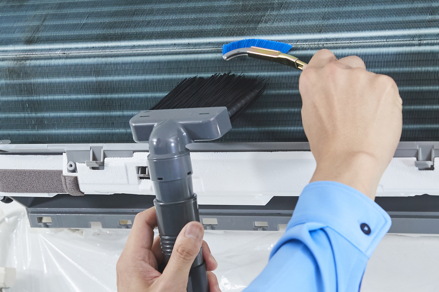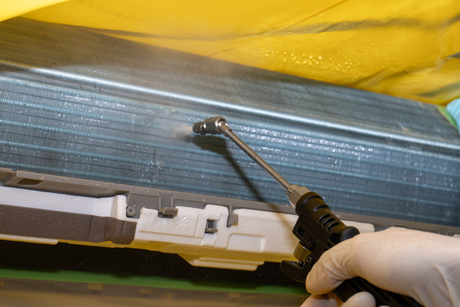 エアコン内部の熱交換器に付着したカビやホコリを、専用の資器材と薬剤で高圧洗浄。洗剤を残さないよう、すすぎもしっかり行います。